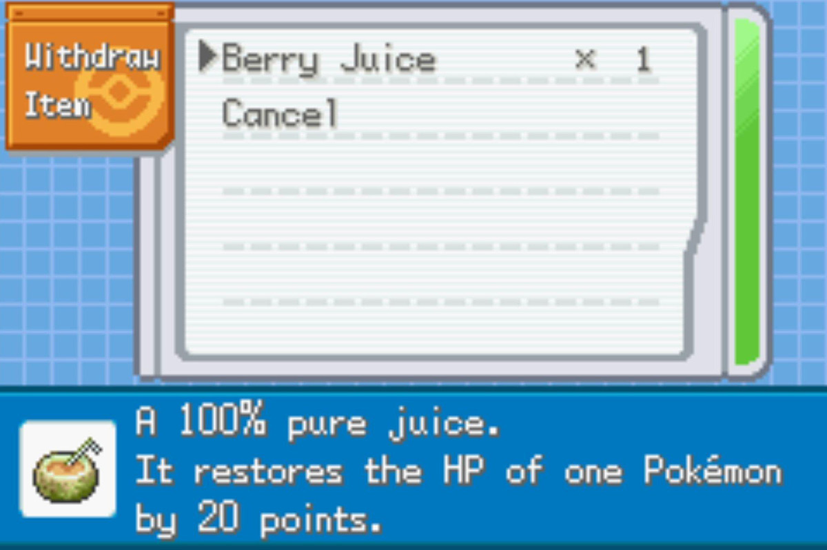 | Berry Juice | Available in your PC at game start | ![]() |